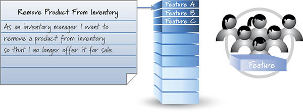 From the database team’s perspective, this item looks like a “feature” that it needs to develop. However, to a feature team, this would have been one of several “tasks” that make up the overall story “Remove a Product from Inventory.” Hence, that which is a feature to a component team is a task to a feature team.
