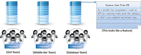 Now let’s look at how that same feature might be handled if implemented by component teams, rather than a feature team. We’ll start by assuming that we have created component teams along architectural boundaries. If so, then in a three-tiered architecture, we would have a GUI team, a middle-tier team, and a database team.