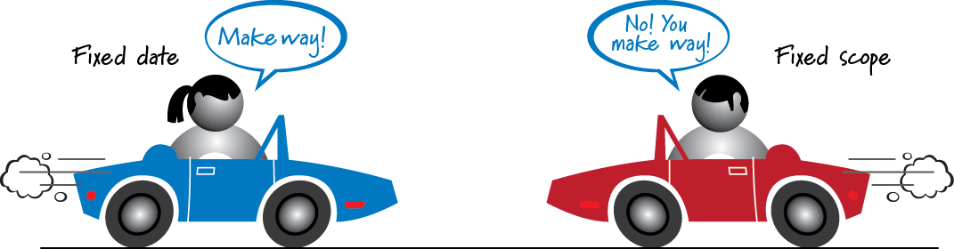 Here’s why. First, date and scope play a game of chicken with one other—they are coming right at each other and one of them had better give way. When we lock them both down so that neither can yield, we reduce our ability to maneuver in the presence of uncertainty. Then, when date and scope inevitably collide, our project will be left with a pile of technical debt—meaning we end up compromising quality.