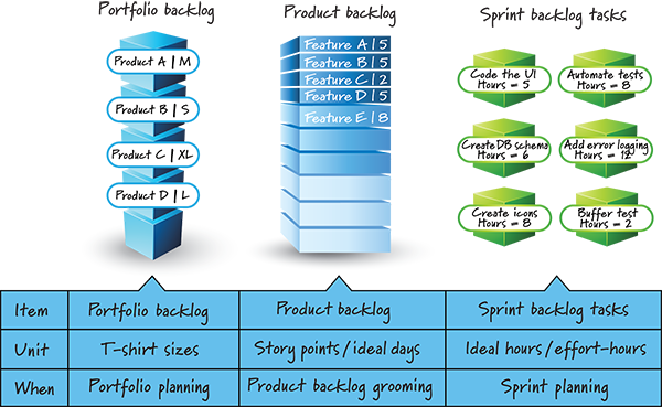 Most of the time when I encounter people who are advocating no estimation, they are referring to size estimates (or magnitude or bigness estimates). As illustrated in the following picture, there are at least three different levels at which such size estimates might be applied: portfolio backlog items, product backlog items, and sprint backlog tasks.
