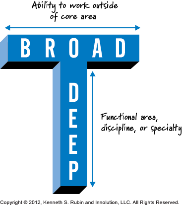 A metaphor used to describe a person with deep vertical skills in a specialized area (such as UX design) as well as broad but not necessarily very deep skills in other relevant areas (such as testing and documentation). Team members with T-shaped skills better enable swarming behavior. See also swarming.